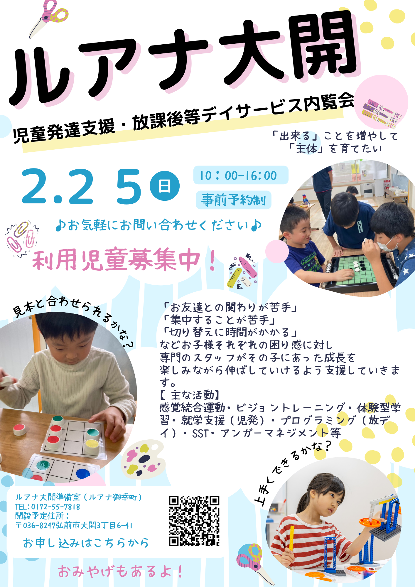ルアナ大開内覧会を行います 重要 2024年01月27日 令和6年2月25日(日)にルアナ大開の内覧会を行います! この機会にぜひ遊びに来てください! 詳細はチラシをご参照の上、グーグルフォームから申込できます。 直接お電話での申し込みや問い合わせも受け付けておりますのでお気軽にお問い合わせください。 管理者 佐藤